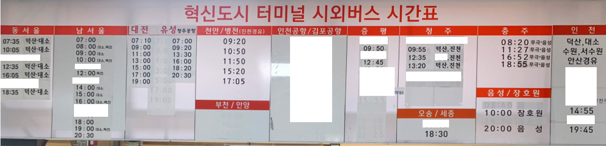 증평으로 가는 버스도 기존에는 배차 간격이 짧았으나 현재는 하루 2회밖에 운행하지 않고, 오송이나 세종으로 가는 차편도 하루 2회였으나 현재는 하루 1회로 충북혁신도시터미널 시간표가 대폭 수정되었습니다. 인천공항으로 가는 노선은 폐지되었으나 인천으로 가는 버스는 하루 2회 운행 중이므로 해당 노선을 이용하는 것도 하나의 방법이 될 수 있겠습니다.