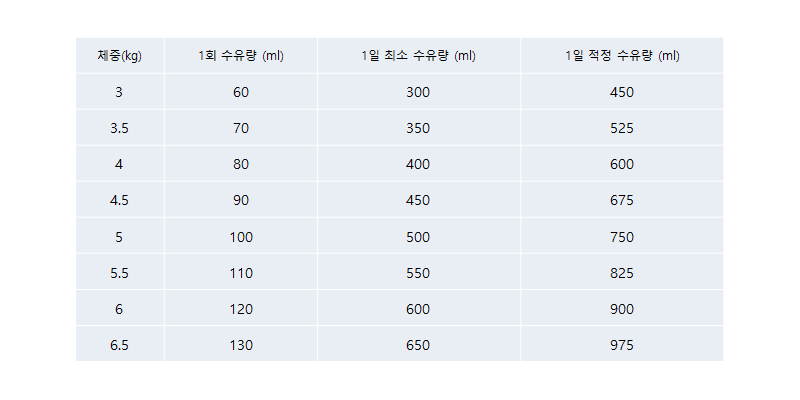 위 표는 일반적으로 권고 되는 신생아 분유량표 입니다. 체중이 3~3.5kg라면 보통 갓 태어난 상태인데요. 이 때에는 60~70ml 정도를 한번에 먹고, 하루에 5~7번, 혹은 그 이상 배고픔을 호소 합니다. 아직은 빠는 힘이 크지 않고 뱃골도 늘지 않은 상태이기 때문에 신생아 분유양 만큼 먹지 못하는 아기도 있고, 적게 먹은 만큼 더 자주 먹으려 드는 아기도 있습니다.