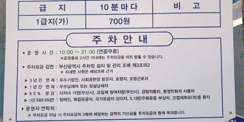 주차요금이 다소 비싸다고 느껴지는 분들은 할인 혜택을 이용하면 보다 저렴한 주차가 가능합니다. 특히 사업자의 경우 우수납세자 또는 성실납세자로 인정 받으면 1년간 주차료가 면제인데요. 그 외 우수기업인, 사회공헌장, 효행자, 모범근로자 등에게 3년간 남포동 공영주차장 요금 면제 혜택이 있습니다.