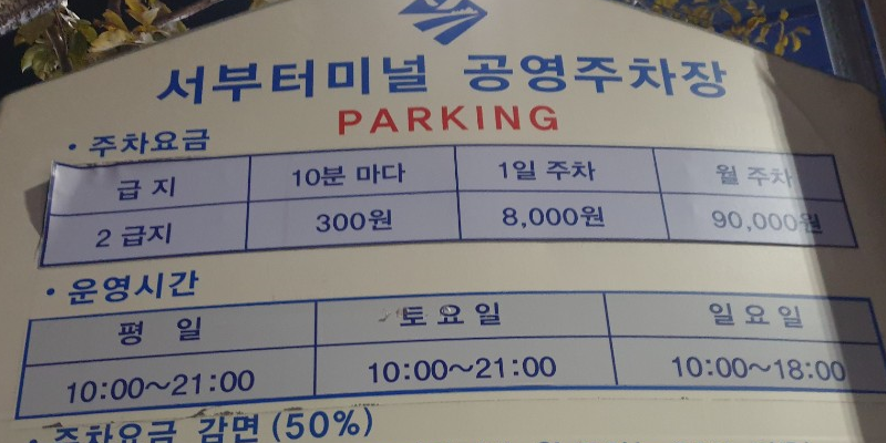 장애인이나 독립유공자의 경우 최초 1시간은 주차 요금이 면제이며, 그 이후에는 부산 서부터미널 공영주차장 요금을 50% 할인 받을 수 있습니다. 평일과 토요일은 오전 10시부터 21시까지 운영 하지만 일요일은 오전 10시부터 18시까지만 운영 합니다. 무엇보다 일 주차 요금이 저렴하므로 오랫동안 근처에서 볼일이 있는 분은 아침 일찍 주차를 해 두면 마음 편히 해야 할 일을 할 수 있을 것으로 보입니다.