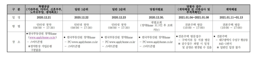동성로 SK리더스뷰 입주자 모집 공고는 2020년 12월 10일에 게시 되었습니다. 특별 공급 접수는 12월 21일에 진행되며, 1순위 청약은 12월 22일입니다. 당첨자 발표일은 12월 30일이며, 계약 체결은 2021년 1월 11일부터 3일간 이루어 질 예정입니다. 청약과 당첨 발표 확인은 모두 청약홈에서 가능합니다.