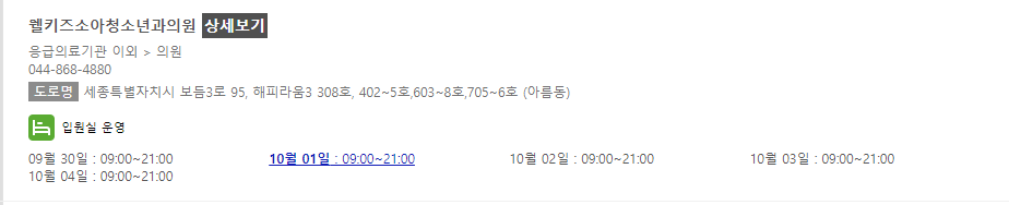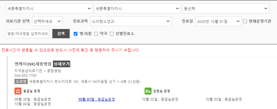 세종시 기준으로도 여러 개의 소아과가 검색 되고 있는데,10월 1일 기준으로 운영 하고 있는 소아과는NK세종병원, 웰키즈 소아청소년과의원, 무지개 소아청소년과의원 등이다.특히 웰키즈는 365일 연중무휴 운영 하므로 급하게 아이가 아플 때에 갈 수 있는 곳으로 기억 해 두자.