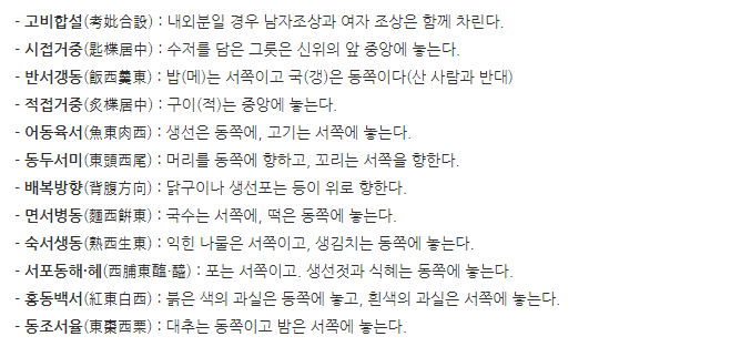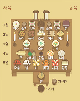 상에 음식을 놓는 순서도 중요하지만최근에는 살아 생전 어르신께서 좋아하시던 음식을 놓는 경우도 많으므로큰 규칙만 따르고 세부적인 위치는 조정 하여도 좋을 것이다.