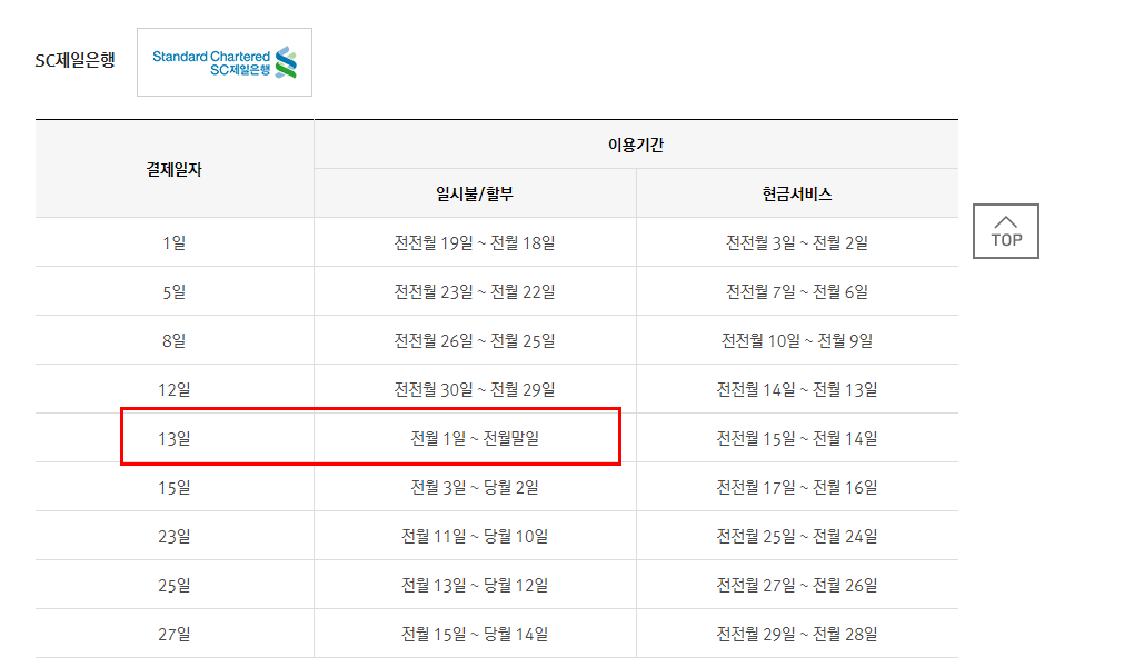전월 1일부터 말일까지의 신용카드 사용 내역을 깔끔하게 한 장으로 받아 보고 싶다면 가장 좋은 선택은 SC제일은행카드 결제일별 이용기간을 확인 하고 13일로 결제일을 지정하는 것 입니다. 이렇게 하면 지난달에 쓴 금액을 이번달 13일에 결제하게 되기 때문에 정확히 한 달 동안 내가 얼마나 지출을 했는지 알 수 있지요.