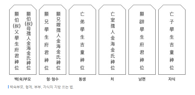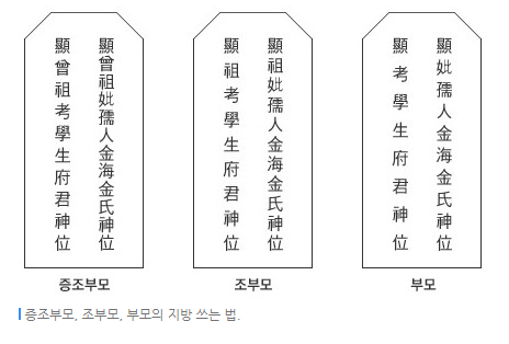 부모 중 한 분이 살아 계시면 지방에는 한 분만 쓰지만,두 분이 다 돌아가셨을 경우 부부는 한 몸 이므로 지방에도 함께 쓰고, 차례도 함께 지낸다.오른쪽에 어머니의 신위를, 왼쪽에 아버지의 신위를 쓰는 것이 옳다.