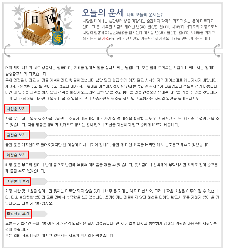 결과보기를 클릭하면 오늘의 무료운세를 볼 수 있는데요. 무료 오늘의 운세이지만 비교적 자세하게 항목별로 나와 있는 것을 볼 수 있습니다. 사업운, 금전운, 애정운, 소원풀이와 희망사항까지 나오기 때문에 중요한 일을 앞두고 있다면 내가 집중하고 있는 일에 대한 오늘의 운세 무료보기가 가능 할 것 입니다.
