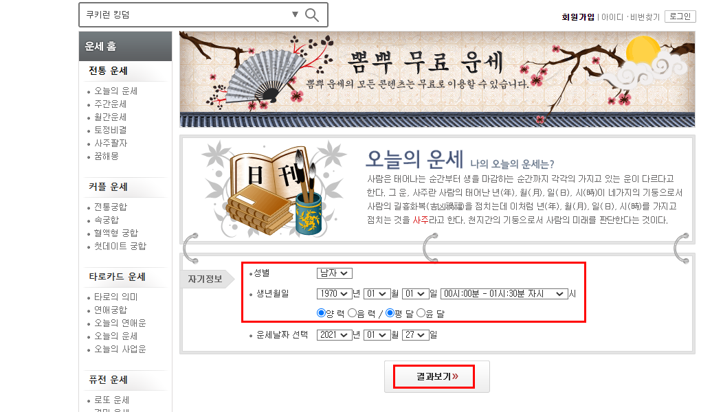 오늘의 무료운세를 보기 위해서는 먼저 해당 사이트에 접속을 해 주면 되는데요. 개인별로 더욱 맞춤 정보를 제공 하기 위하여 성별과 생년월일을 함께 입력하게 되어 있습니다. 운세는 결국 사주를 기반으로 결정되는 것이므로 태어난 년, 월, 일, 시를 보고 미래를 판단 하게 됩니다.