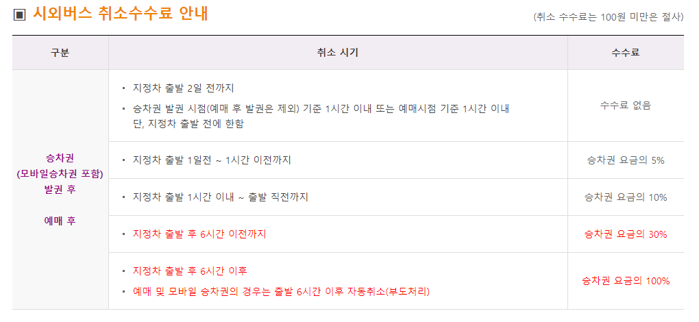 시외버스 취소 수수료는 출발 전에는 고속버스 예매 취소 수수료와 같지만, 출발 후에는 약간 다른데요. 시외버스는 출발 후 6시간 이내에는 취소 수수료가 요금의 30%이고, 출발 후 6시간 이후부터 취소 수수료가 100%인 점이 차이입니다. 고속버스의 경우 도착예정시간을 기준으로 하므로 이 부분에 차이가 있으니 시외버스는 예매 후 타지 못하는 일이 생기더라도 꼭 취소 가능시간을 한번 더 확인 하시기 바랍니다.