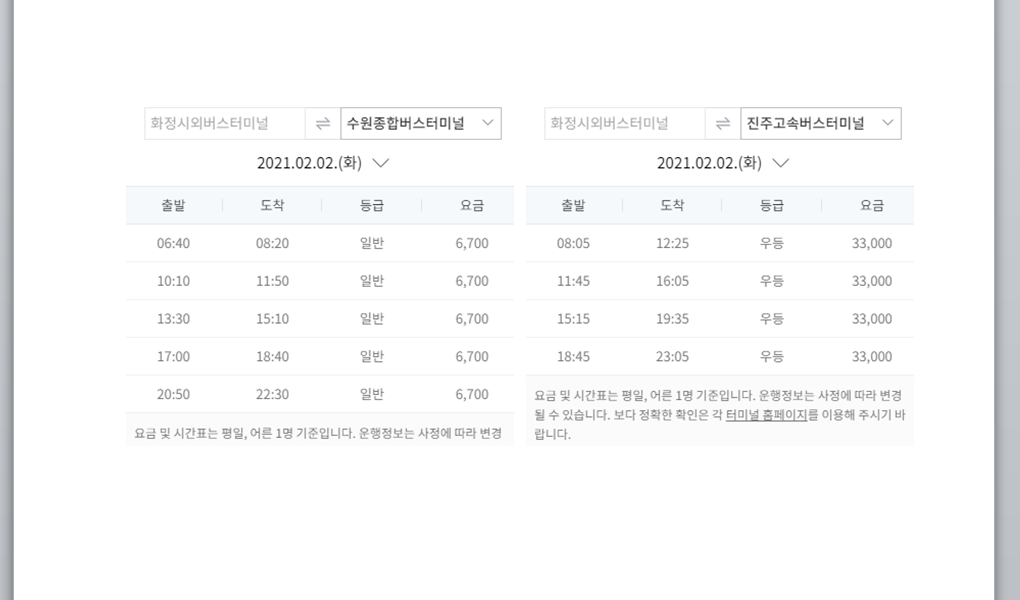 화정시외버스터미널 시간표를 보면 요금을 함께 조회 할 수 있도록 되어 있습니다. 화정터미널에서 수원행 버스를 예매 할 때에는 요금이 6,700원, 화정터미널 버스시간표에서 진주고속버스터미널을 선택 하면 요금이 33,000으로 조회 됩니다.
