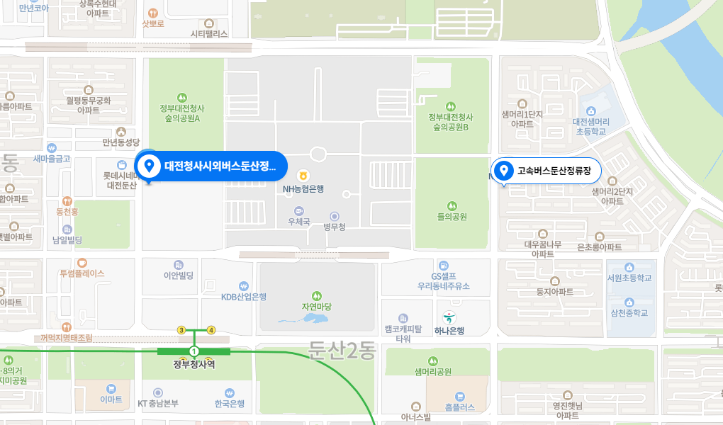 대전청사 시외버스터미널은 고속버스터미널 둔산정류장과 다른 위치에 있습니다. 둘 다 둔산정류장이라는 이름을 갖고 있지만 시외버스를 타는 곳은 "대전청사 시외버스터미널"이고, 고속버스를 타는 곳은 "고속버스 둔산정류장"이므로 반드시 두 곳의 위치를 구분 하여야 합니다. 이 글 하단에 두 곳의 위치와 함께 고속버스 둔산정류장 시간표도 기재 해 두었습니다.