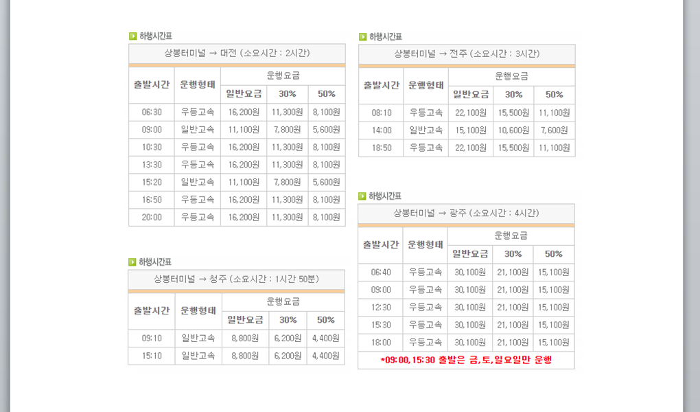 상봉터미널 홈페이지에 전체 상봉터미널 시간표가 나와 있지만, 워낙 노선이 다양하지 않고 배차 시간도 많지 않아 위에 캡쳐 된 내용이 전부인데요. 이용하고자 하는 노선이 원하는 시간대가 없다면 강남고속버스터미널 시간표나 동서울터미널 시간표를 함께 확인 해 보는 것도 도움이 될 것 입니다.