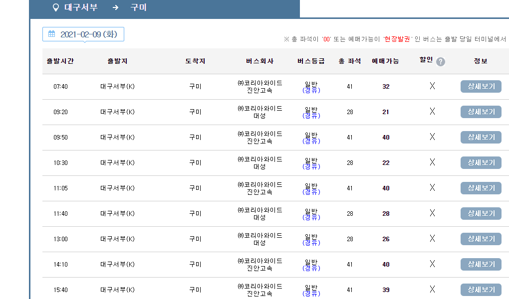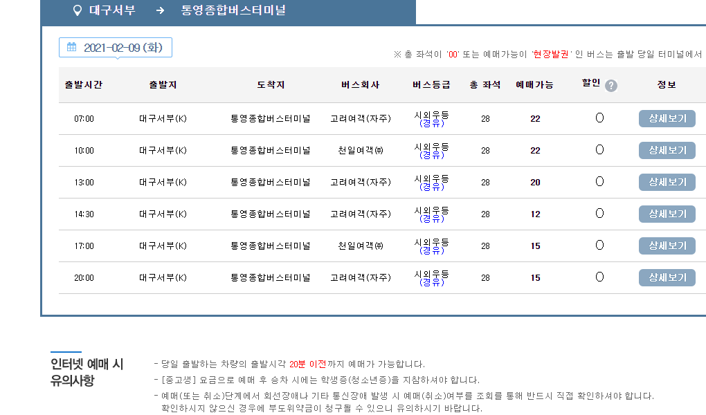 예매를 할 때에 총 좌석이 00으로 표기 되어 있는 경우가 있는데요. 이는 해당 시간대에 배차는 되어 있으나, 예매는 받지 않는 노선이기 때문에 출발 당일에 터미널에 조금 일찍 도착하여 발권 하여야 합니다. 서부정류장에서 합천 해인사로 가는 버스가 간혹 이런 경우가 있으므로 서부정류장을 이용하는 분들은 참고 부탁드립니다.