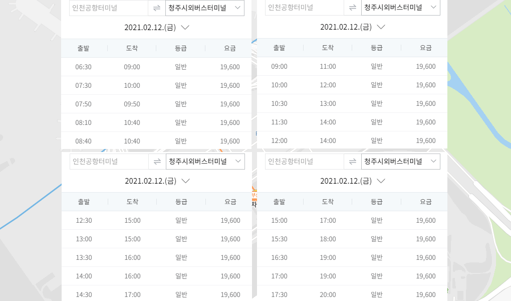 인천공항터미널 시간표를 보면 요금도 함께 조회 할 수 있습니다. 우등인지 일반인지, 또 고속버스인지 시외버스인지에 따라 그 요금에는 차이가 있는데요. 청주 시외버스터미널로 가는 노선은 심야의 경우 21,600원, 그 외 시간대는 19,600원의 운임으로 이용 할 수 있습니다.