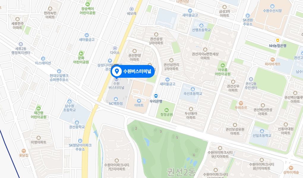 수원버스터미널은 경기도 수원시 권선구 권선동에 위치 하고 있습니다. 이마트와 NC백화점 인근에 위치 하고 있기 때문에 수원터미널 시간표를 맞추지 못하였을 때에 여유있게 시간을 보낼 곳도 있고, 맛집도 많은 곳인데요. 서수원시외버스터미널과는 다른 곳이므로 구분이 필요 합니다.