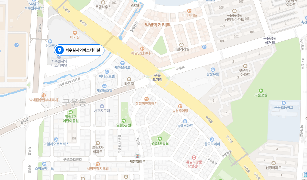 서수원 버스터미널은 수원시 권선구 구운동에 위치 하고 있습니다. 수원버스터미널과 서수원버스터미널이 둘 다 권선구에 위치 하고 있기 때문에 혼동하지 않도록 주의 하여야 하는데요. 이마트 서수원점 인근에 있기 때문에 구분에 큰 어려움은 없을 것으로 보입니다.
