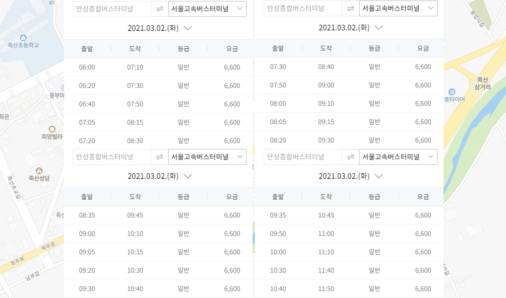 안성종합버스터미널 홈페이지에 방문 하면 안성터미널 시간표를 확인 할 수 있는데요. 이 외에도 고속버스의 경우 코버스에서, 시외버스의 경우에는 버스타고또는 티머니에서 안성버스터미널 시간표 조회 및 예매가 가능합니다.