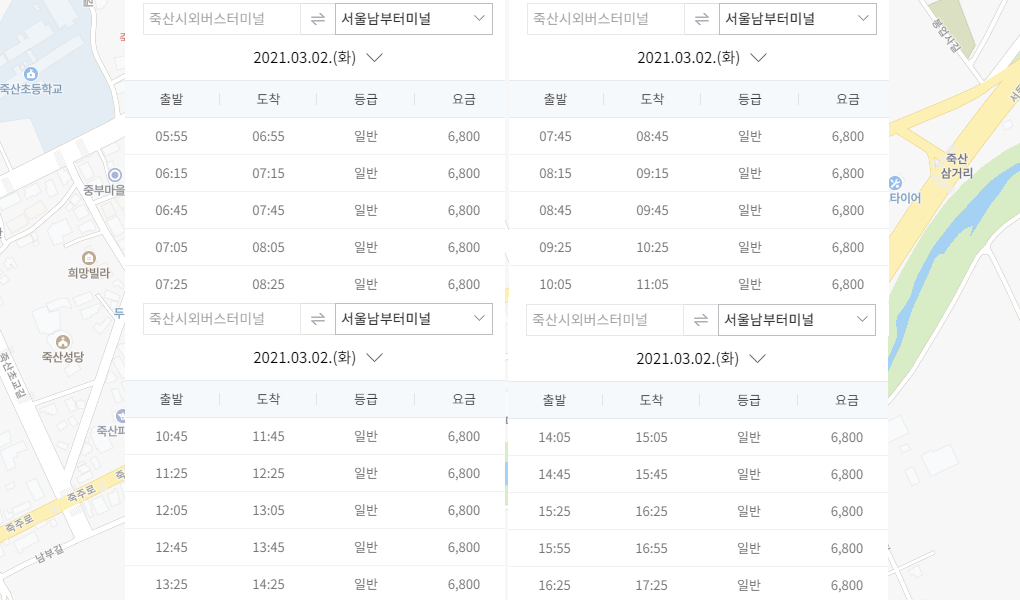 죽산터미널은 시외버스이기 때문에 버스타고 또는 티머니에서 시간표 조회 및 예약을 할 수 있습니다. 현재 코로나로 인하여 노선에 변동이 많으니 반드시 죽산시외버스터미널 시간표를 보고 예매까지 미리 하시기 바랍니다.
