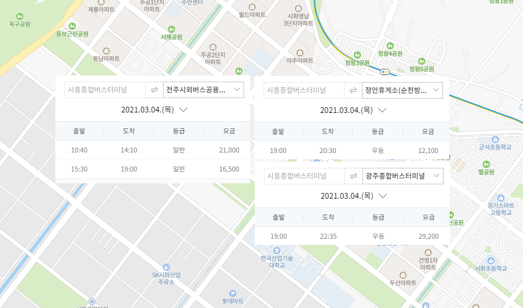 시흥종합버스터미널 시간표를 보면 깜짝 놀랄 정도로 배차가 적습니다. 하루 종일 운행 하는 모든 노선을 다 합해도 4대밖에 되지 않을 정도인데요. 시흥터미널에서 전주시외버스터미널로 가는 버스가 10시 40분, 15시 30분에 있고, 시흥버스터미널에서 정안휴게소로 가는 버스가 19시에, 시흥시외버스터미널에서 광주종합버스터미널로 가는 버스가 19시에 각각 있습니다.