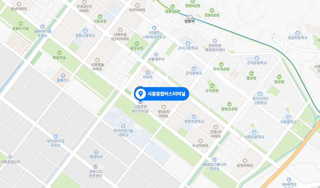시흥종합버스터미널은 경기도 시흥시 정왕동에 위치 하고 있습니다. 지하철 4호선 정왕역 인근에 위치 하고 있지만 도보로 이동하기에 가까운 거리는 아니기 때문에 되도록이면 자가용을 이용 하거나 버스를 이용 하는것이 더 편리할 수 있습니다. 인근에 이마트, 스타벅스 등이 있어 시흥버스터미널 맛집을 찾기는 어렵지 않습니다.