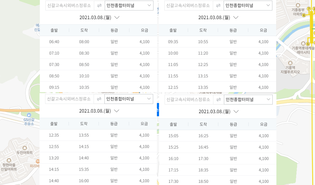 용인신갈고속버스터미널 시간표는 코버스에서 확인 및 예매가 가능합니다. 또한 신갈시외버스터미널 시간표는 버스타고 또는 티머니에서 조회 하고 예매 해야 합니다. 신갈고속시외버스터미널 시간표는 코로나 등으로 인하여 수시로 변경될 수 있으므로 반드시 예매까지 마치는 것이 중요합니다.