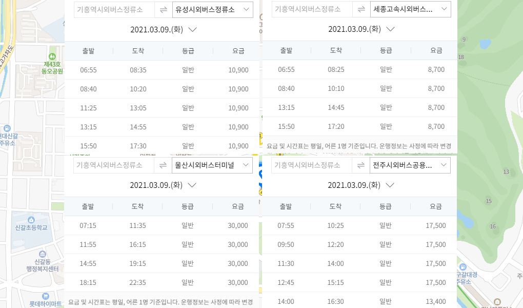 예매 한 차를 타지 못했을 때에는 고속버스 예매 취소 수수료시외버스 예매 취소 수수료가 다르게 적용될 수 있으므로 꼭 확인 하시기 바랍니다. 기흥역 시외버스정류소 시간표를 맞추지 못해서 차를 놓쳤을 때에는 시외버스가 조금 더 유리합니다.