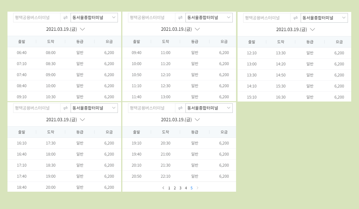 평택터미널에서 고속버스를 이용 하고자 하는 분들은 코버스에서 정확한 시간표 확인 및 예매를 할 수 있습니다. 평택시외버스터미널 시간표와 요금은 버스타고 또는 티머니에서 확인 가능하오니 확인 하시기 바랍니다.