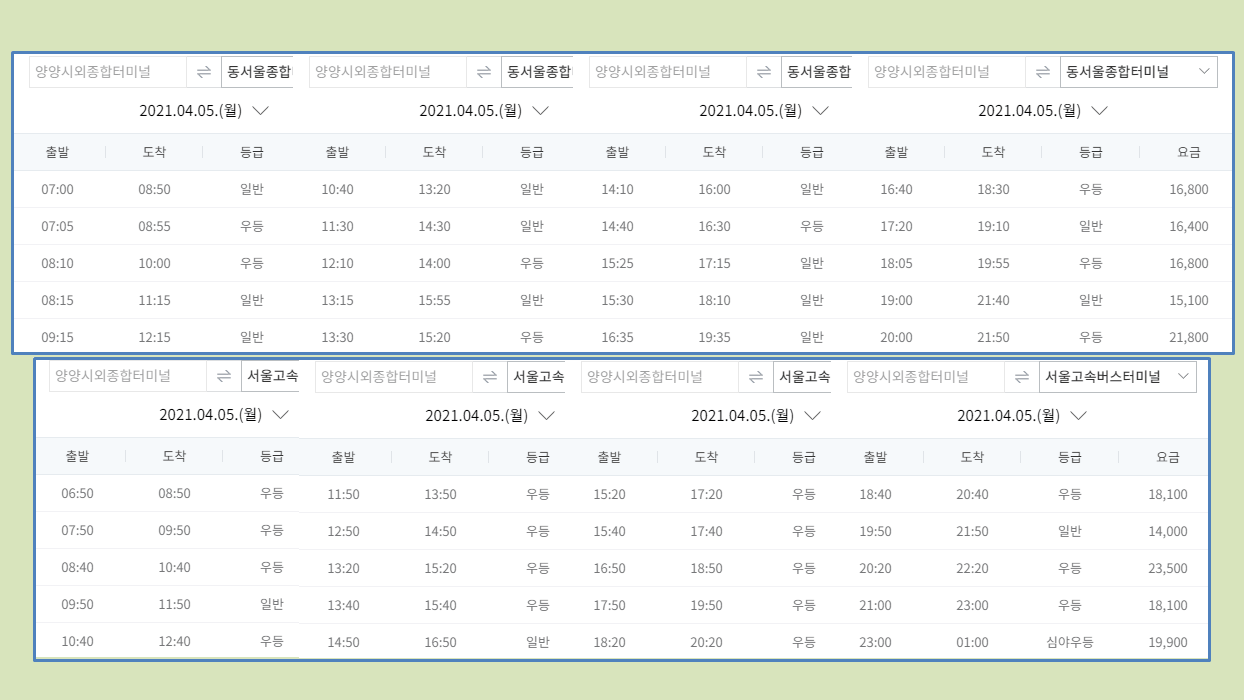 양양시외버스터미널 시간표에는 요금정보가 함께 표시 되어 있습니다. 시간과 차량 배치에 따라 동서울로 가는 양양터미널 요금은 15,100원에서 21,800원까지 다양한데요. 우등인지, 일반인지, 배차시간에 따라 모두 다르므로 확인이 필요 합니다.