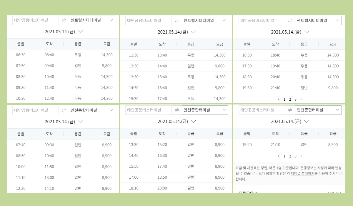 태안공용버스터미널 시간표 예매를 마쳤다면 센트럴시티터미널 시간표를 참고하여 태안터미널로 돌아오는 노선도 미리 예매 해 두면 일정 관리를 보다 효율적으로 할 수 있을 것 입니다.