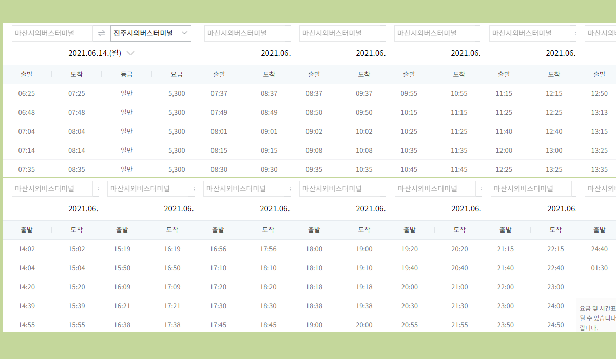 마산시외버스터미널 시간표 확인과 예매는 버스타고또는 티머니에서 가능합니다. 시간표 변경이 잦으므로 반드시 마산터미널 최신 시간표를 확인 하고 마산고속버스터미널 시간표와 비교하여 예매를 해 두는 것이 좋습니다.