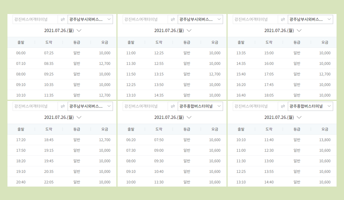 강진터미널 시간표 확인 및 예매를 마쳤다면 광주남부시외버스터미널 시간표, 광주종합버스터미널 시간표등을 확인하여 돌아오는 여정까지 예매 해 두는 것이 보다 편안한 여행을 위한 방법일 것 입니다.