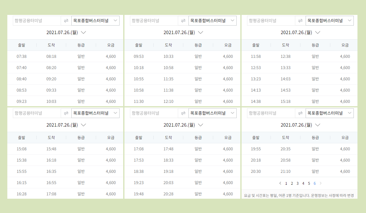 함평터미널 시간표 확인 및 예매를 마쳤다면 보다 효율적인 시간 관리를 위하여 목포종합버스터미널 시간표 등을 확인하여 돌아오는 차편도 함께 예매 해 두시기 바랍니다.