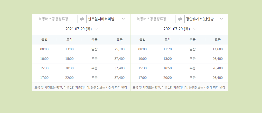 녹동터미널에서 센트럴시티터미널로 갈 때에는 일반 25,100원, 우등 37,400원의 운임이 책정 되어 있습니다. 녹동버스터미널에는 정안휴게소로 가는 노선도 있는데요, 해당 노선은 17,600원 또는 26,400원의 운임이 필요합니다.