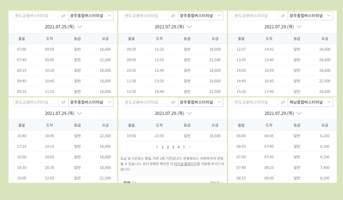 완도터미널 시간표 확인과 예매를 마쳤다면 보다 효율적인 일정 관리를 위하여 광주종합버스터미널 시간표등을 확인하고 돌아오는 여정까지 함께 예매를 해 두는 것도 좋은 방법이 될 것 입니다.
