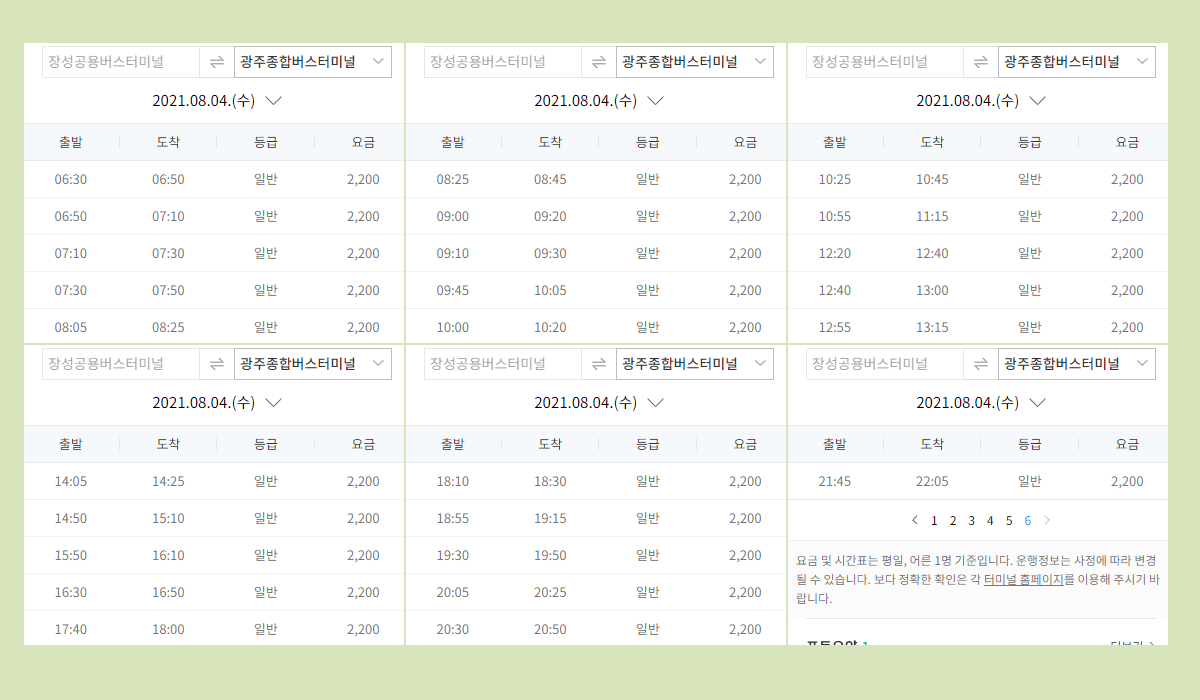 장성터미널 시간표 확인과 예매를 하고 나면 광주종합버스터미널 시간표등을 확인하여 돌아오는 차편도 함께 예매 해 두시면 좋습니다. 시간표 변경이나 축소 등이 종종 있으므로 되도록 미리 시간표를 확인하고 예매 하는 습관을 만드시기를 바랍니다.