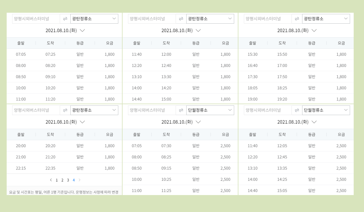 양평시외버스터미널 요금