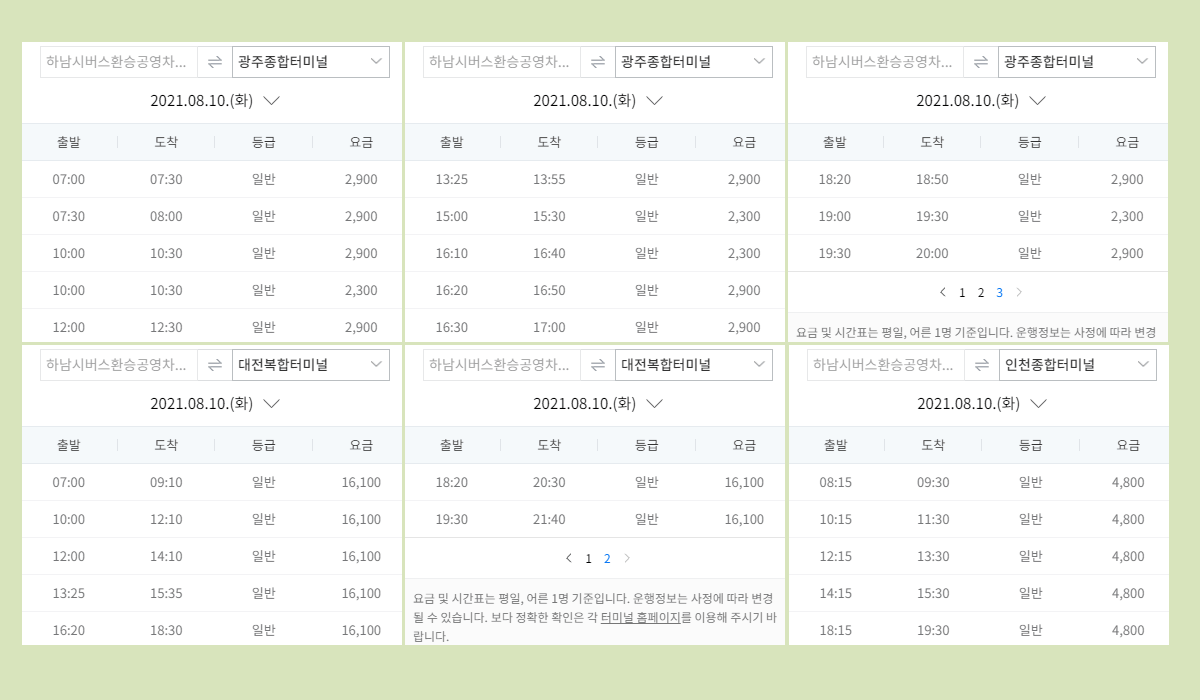 다만 서울에서 하남을 방문하는 분들은 대부분 지하철, 버스 등을 이용하다 보니 하남시외버스터미널 시간표를 보면 광주종합터미널, 대전복합터미널, 인천종합터미널 등의 노선이 주로 운행 되고 있는데요. 하남터미널에서 광주종합터미널로 가는 첫차는 오전 7시에, 막차는 19시 30분에 출발 하고 있습니다.