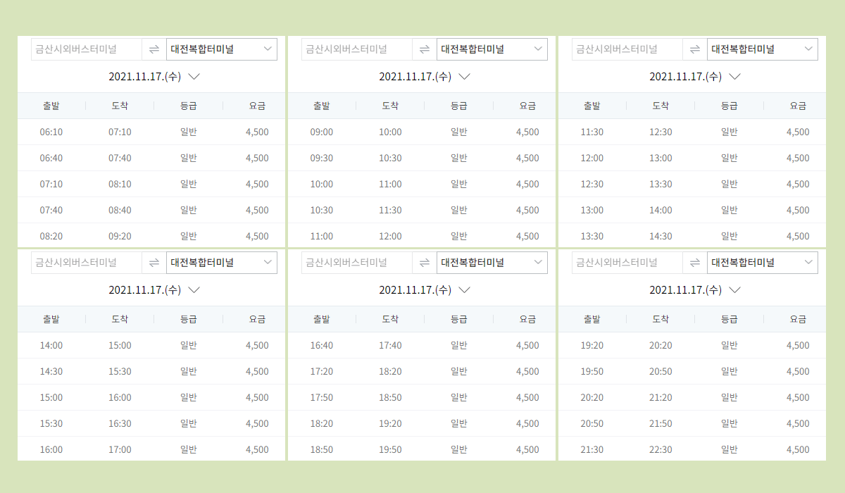 금산시외버스터미널 시간표 확인과 예매를 하기 위해서는 고속버스는 코버스에서, 시외버스는 버스타고 또는 티머니에서 진행 할 수 있는데요. 고속버스와 시외버스 모두 원하는 노선이 없을 때에는 이근 마전시내버스터미널, 원평공용버스터미널 등을 참고 하시는 것도 좋습니다. 대전 복합터미널 시간표, 강남고속버스터미널 시간표등을 참고하여 돌아오는 시간표도 함께 예매 해 두면 더 좋을 것 입니다.